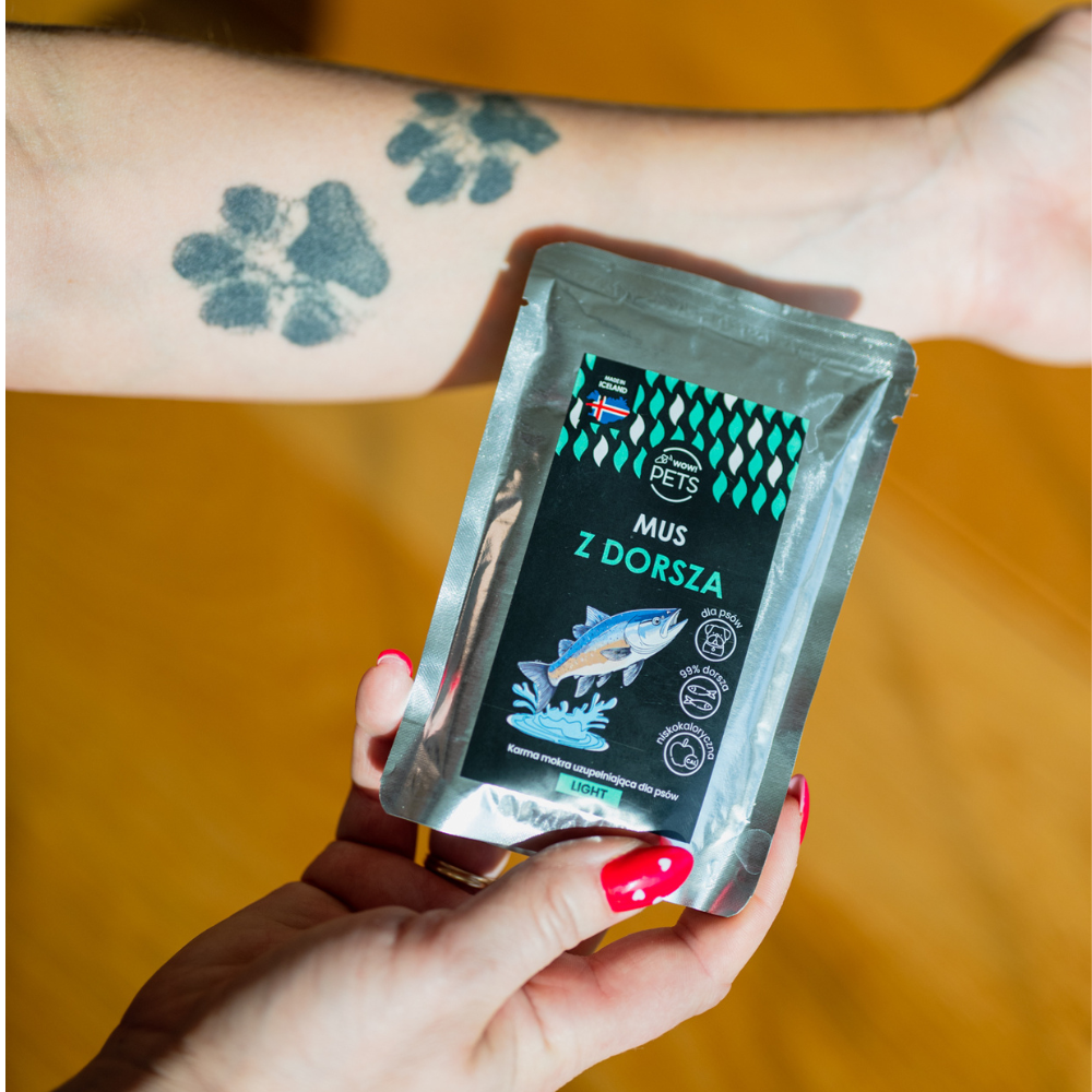 Mus z dorsza WOW!PETS to mokra karma light stworzona z myślą o psach z tendencją do nadwagi, starszych lub wymagających delikatniejszej diety.